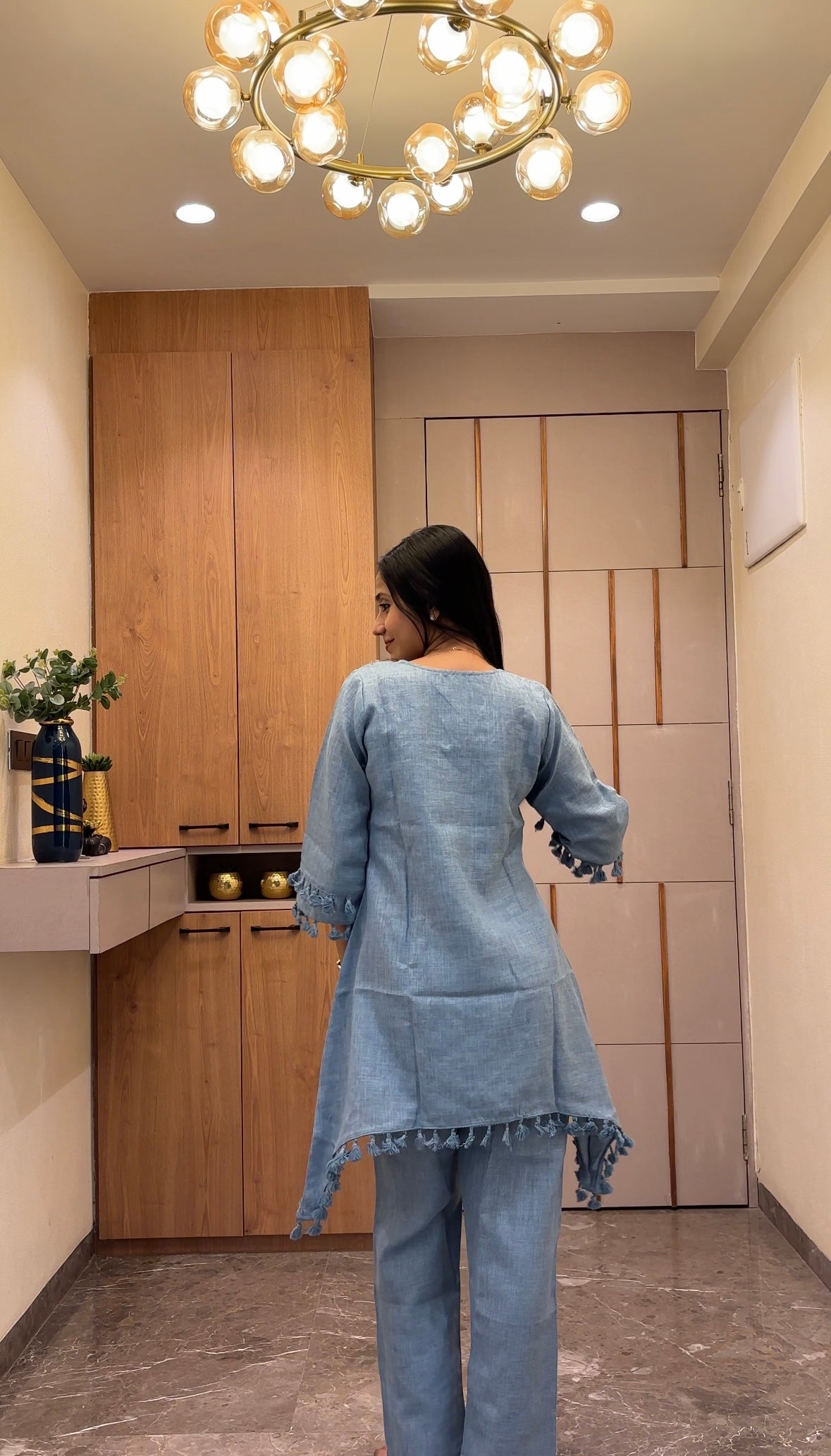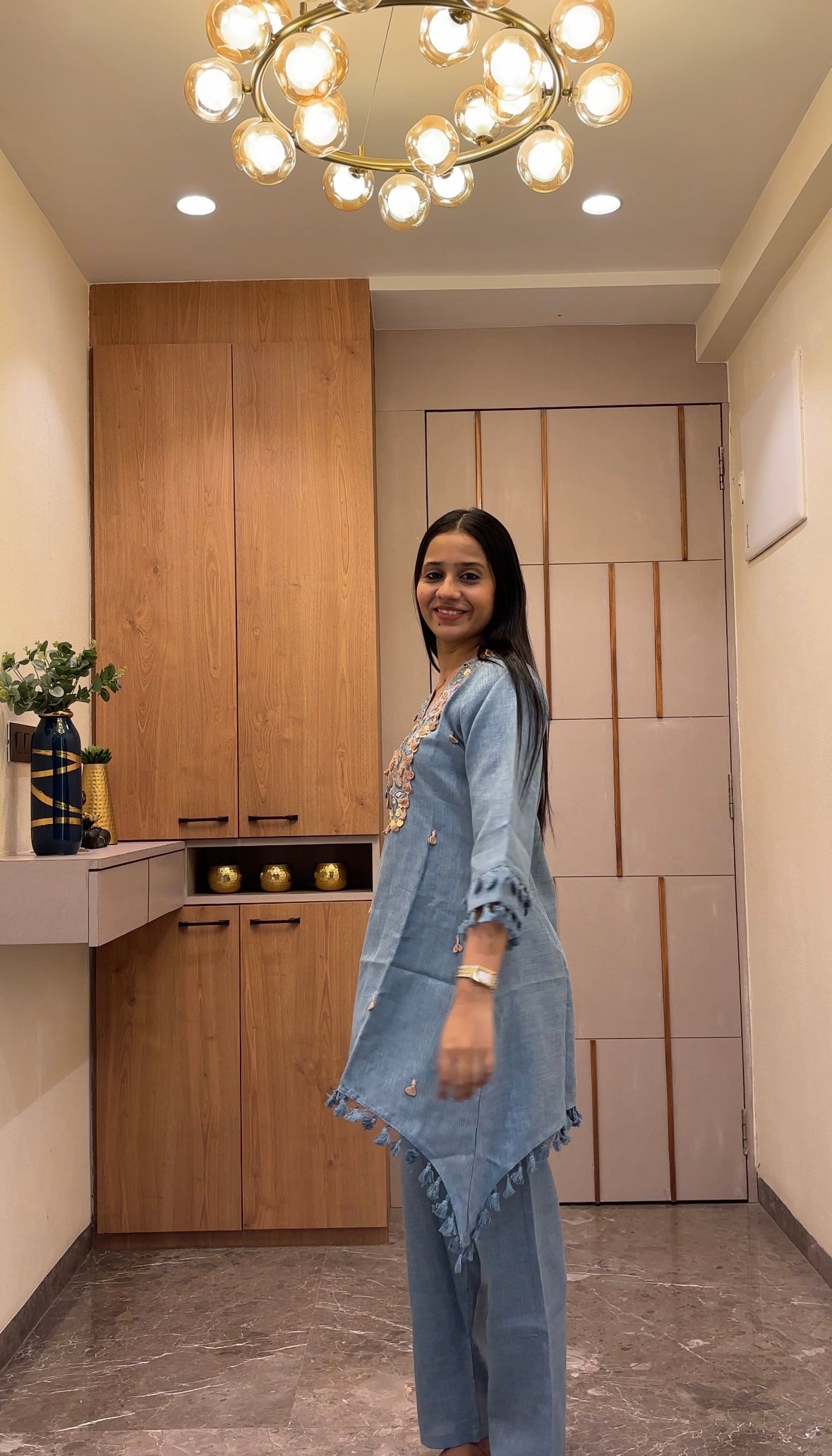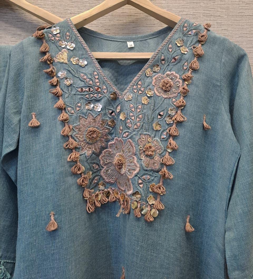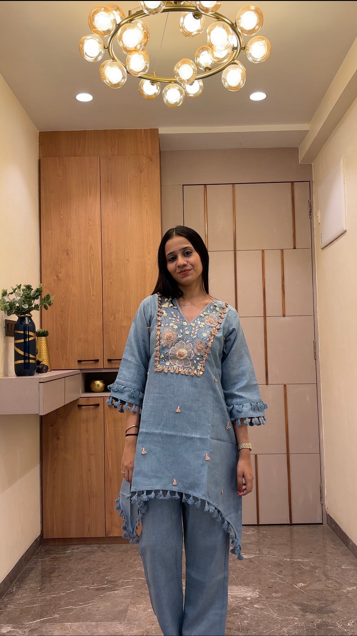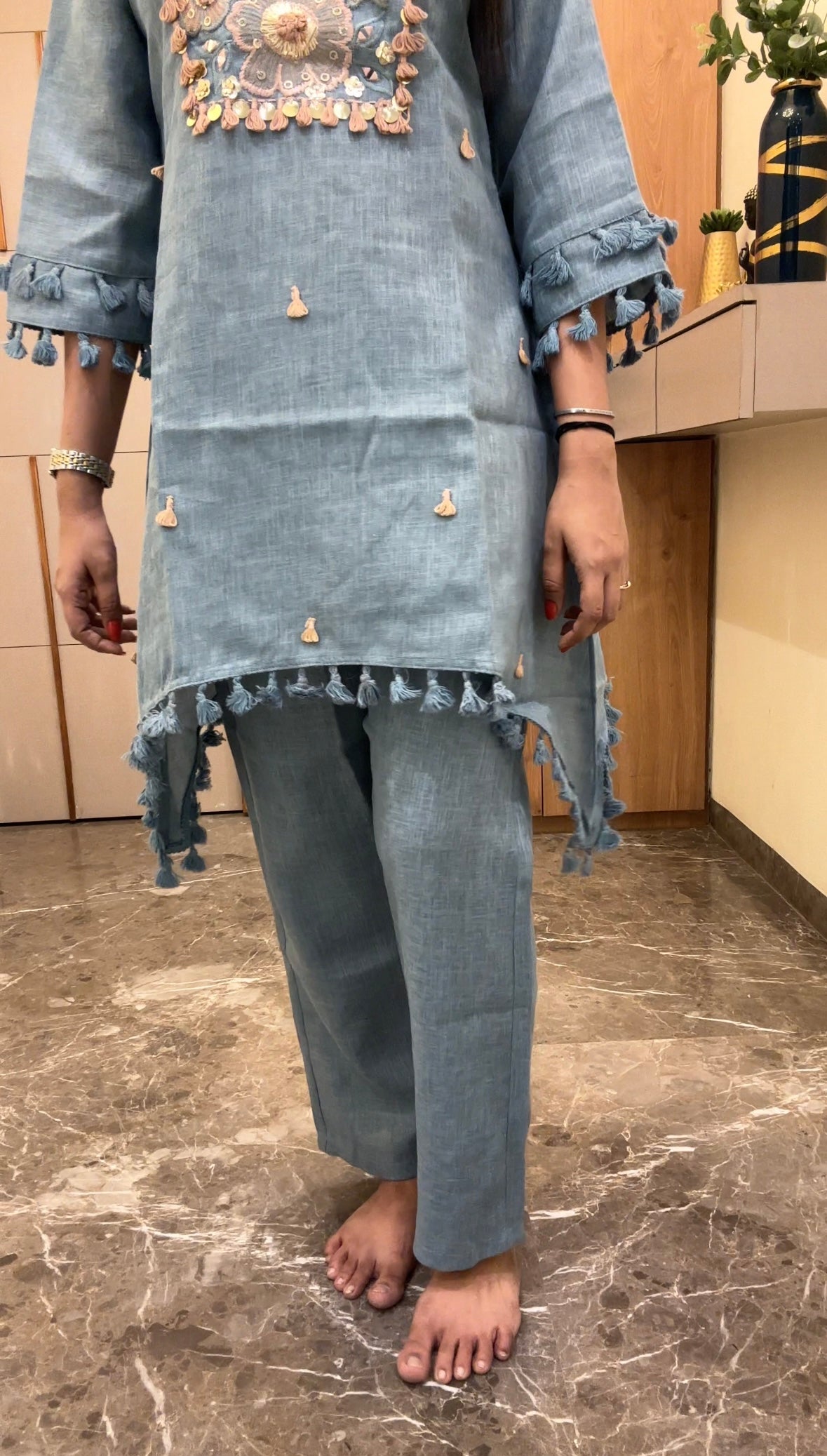 This striking blue and peach tassel Indo-Western kurta set, designed for the modern woman who values tradition with contemporary flair. Featuring intricate tassel and mirror work detailing and a flattering silhouette, this versatile ensemble transitions seamlessly from casual gatherings to festive occasions. The rich hues complements all skin tones, while the Indo-Western cut offers comfort without compromising on style. Perfect for weddings, celebrations, or everyday elegance, this kurta set combines craftsmanship with wearability. Ideal for those seeking premium ethnic wear that makes a statement.