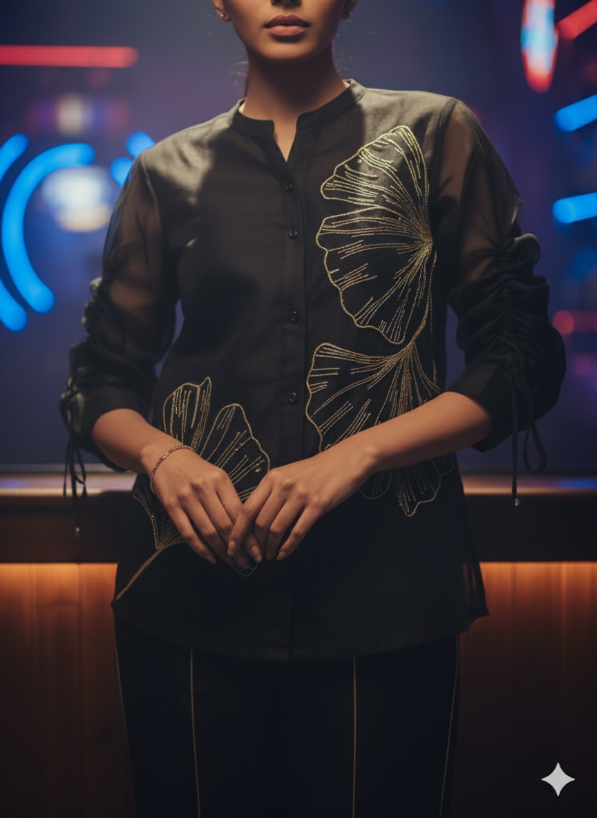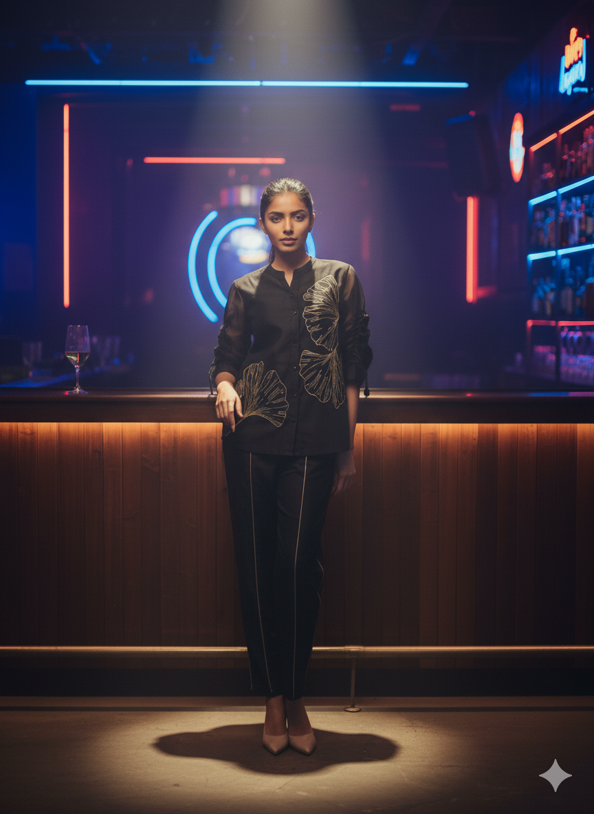 This Partywear Black and Golden Co-Ord crafted from premium chanderi and organza fabrics features intricate zari embroidery with contemporary style, offering a graceful silhouette perfect for special occasions. Lightweight and breathable, it ensures comfort while making a stunning statement. Ideal for celebrations, this co-ord set adds a touch of luxury and charm to your partywear collection.