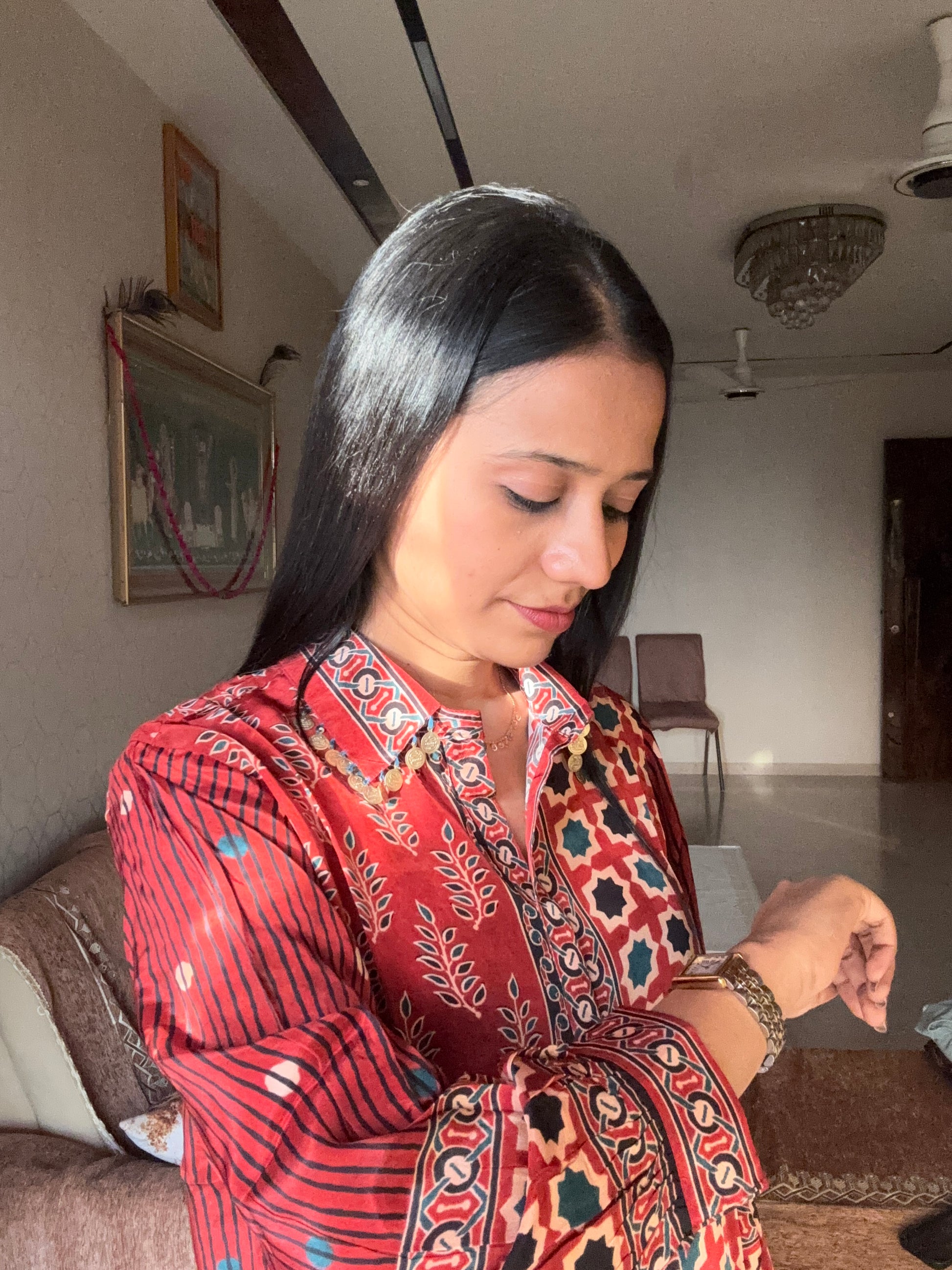 Crafted from lightweight crepe fabric, this digitally printed shirt top features intricate Ajrakh motifs that celebrate ethnic heritage while maintaining modern versatility. Ideal for festive celebrations, professional settings, and curated casual styling, it effortlessly transitions from occasion wear to everyday wear. The breathable construction ensures comfort throughout the day, while the refined silhouette flatters multiple body types.