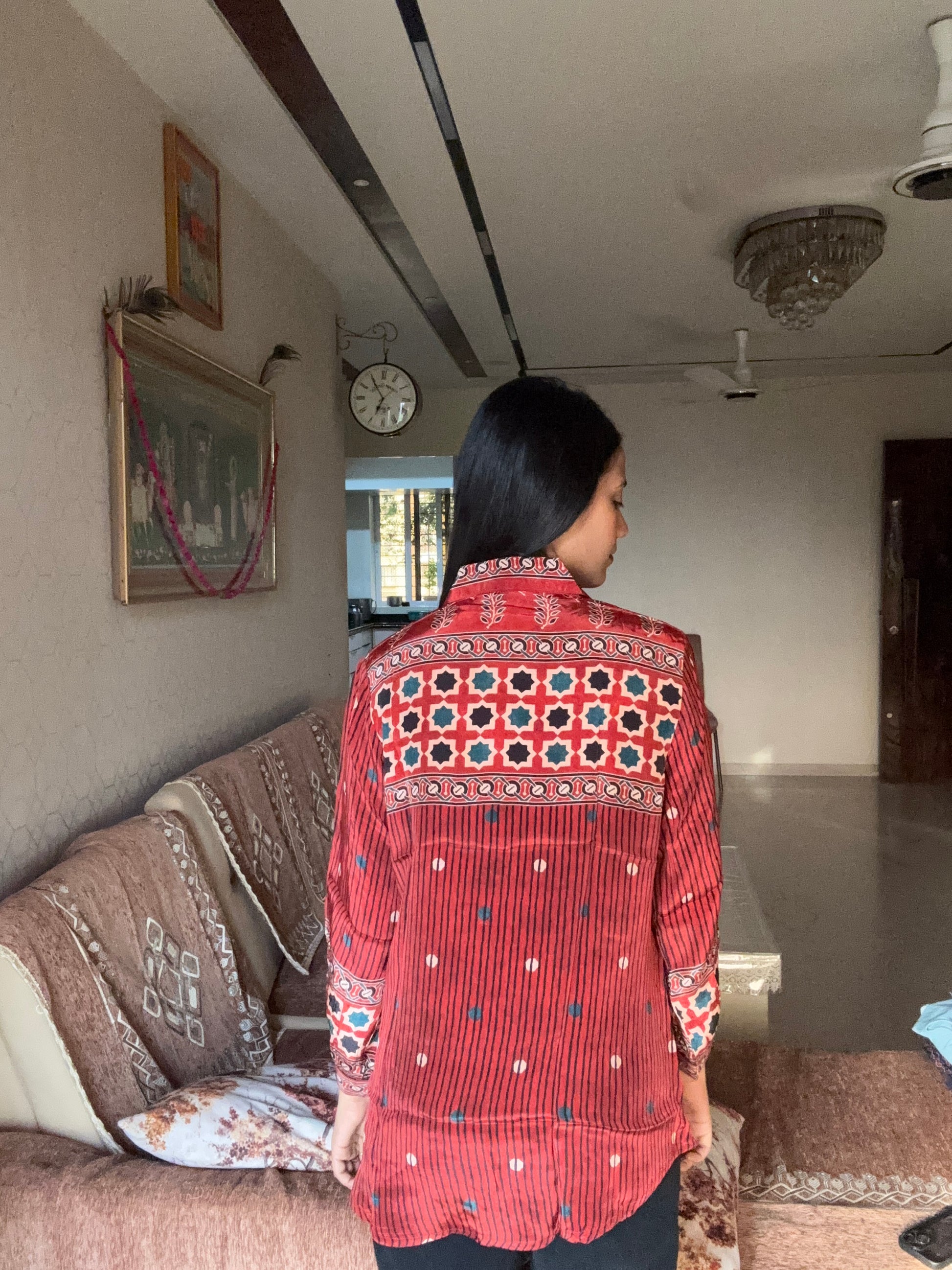 Red Ajrakh Printed Indo-Western Crepe Shirt Top