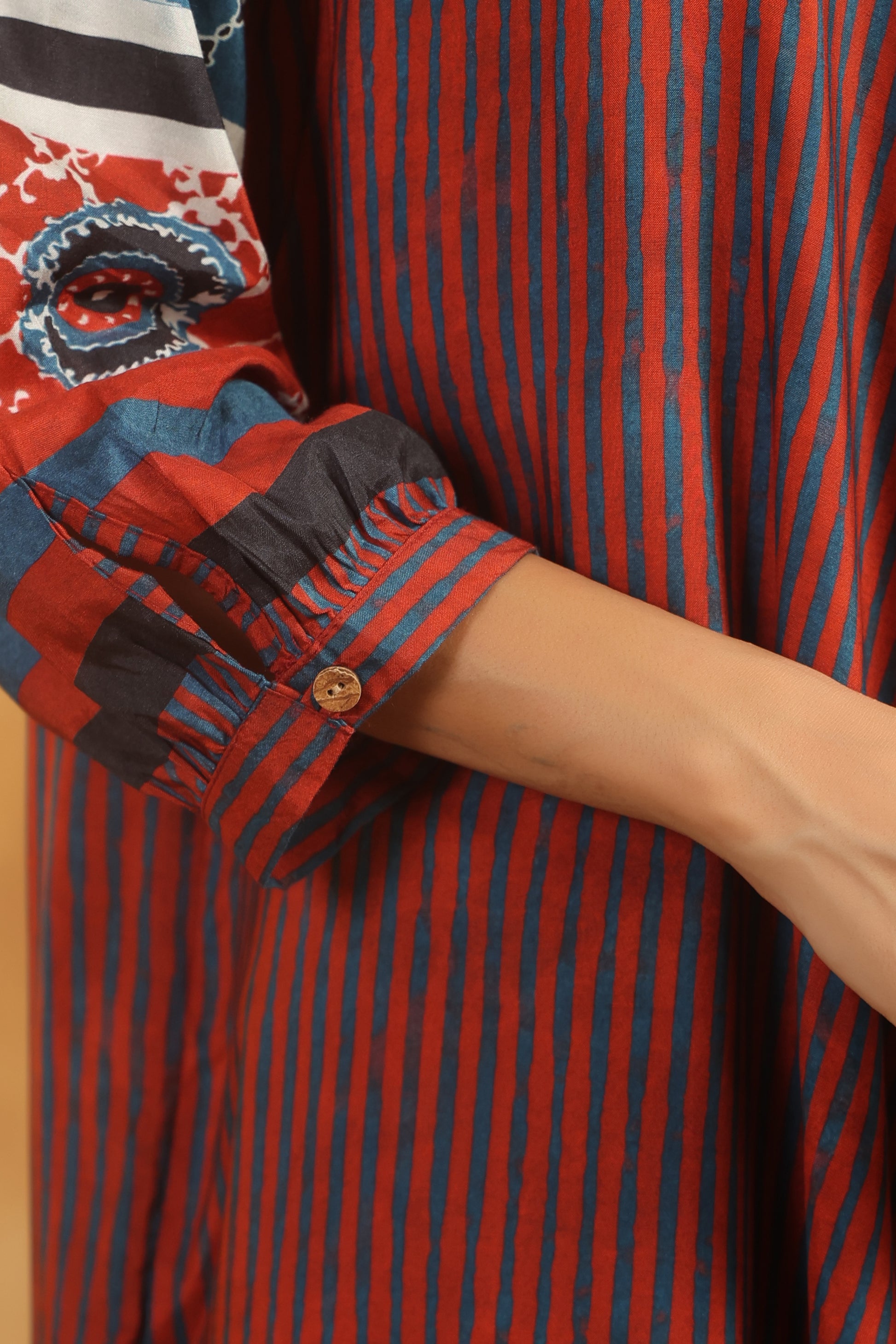 Give your everyday wardrobe a stylish update with this Rust Muslin Flared Kurti, crafted in ultra-soft premium muslin for a breezy, comfortable feel. The subtle vertical stripes enhance the silhouette, while the contrasting printed sleeves add a vibrant, artsy touch.