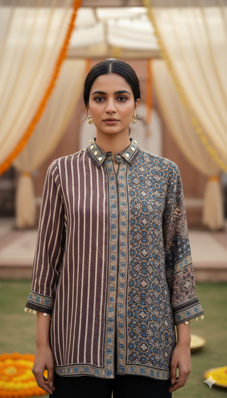 Crafted from lightweight crepe fabric, this digitally printed shirt top features intricate Ajrakh and motifs that celebrate ethnic heritage while maintaining modern versatility. Ideal for festive celebrations, professional settings, and curated casual styling, it effortlessly transitions from occasion wear to everyday wear. The breathable construction ensures comfort throughout the day, while the refined silhouette flatters multiple body types.