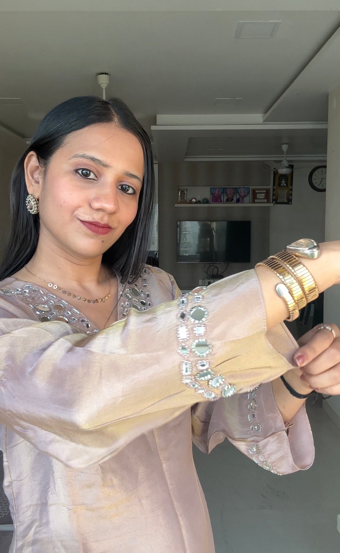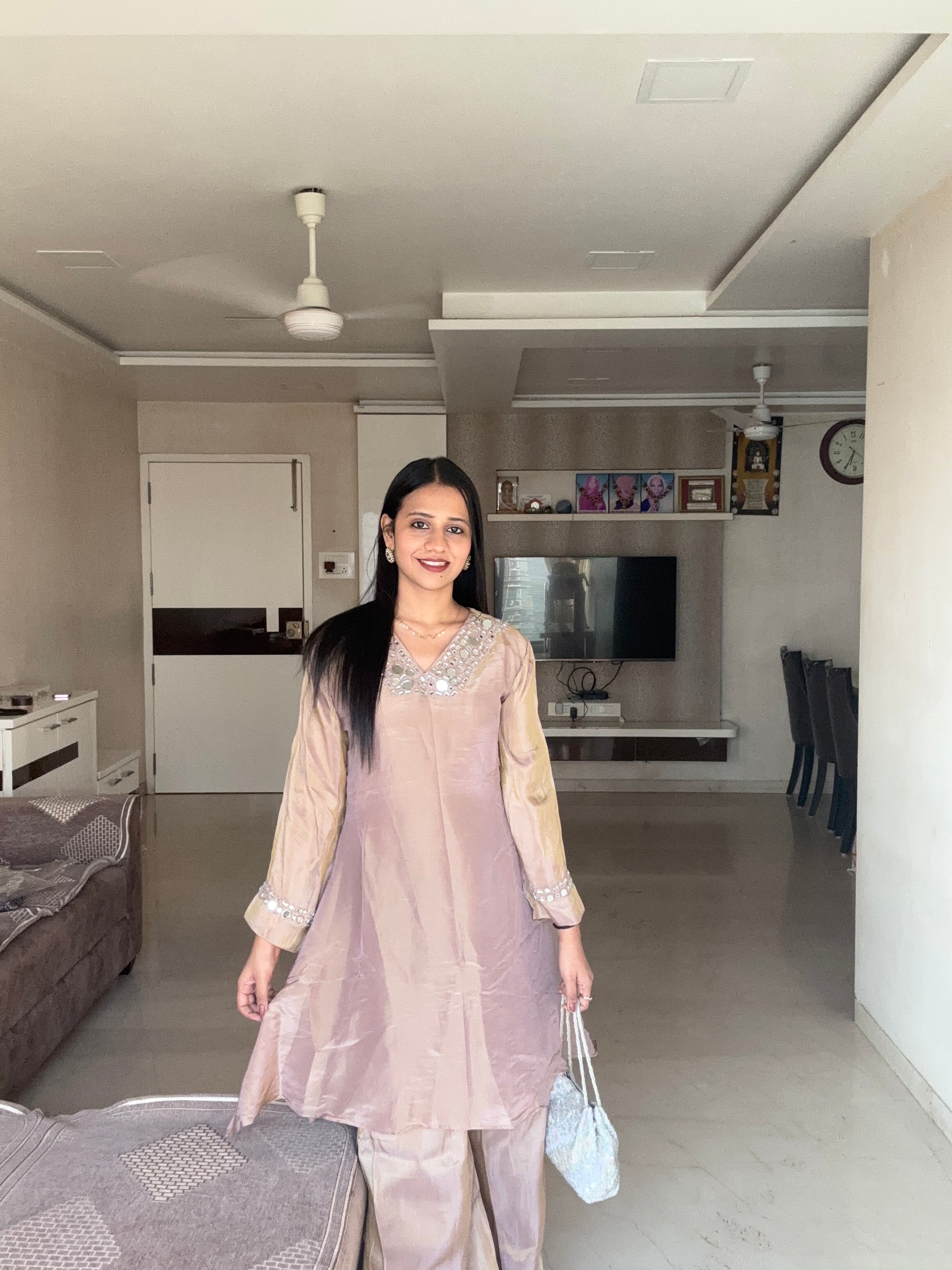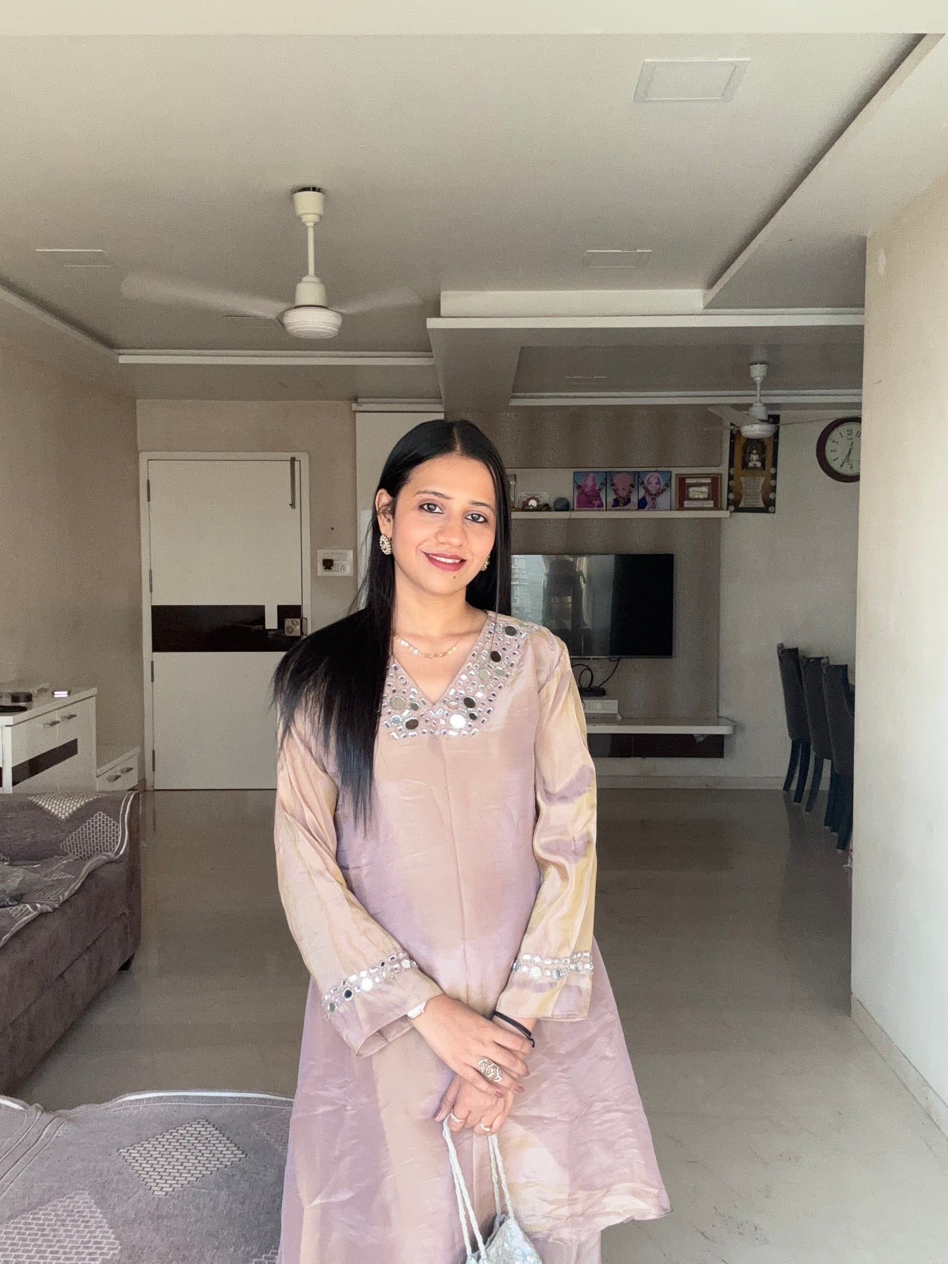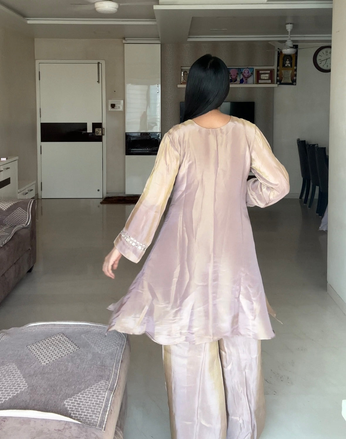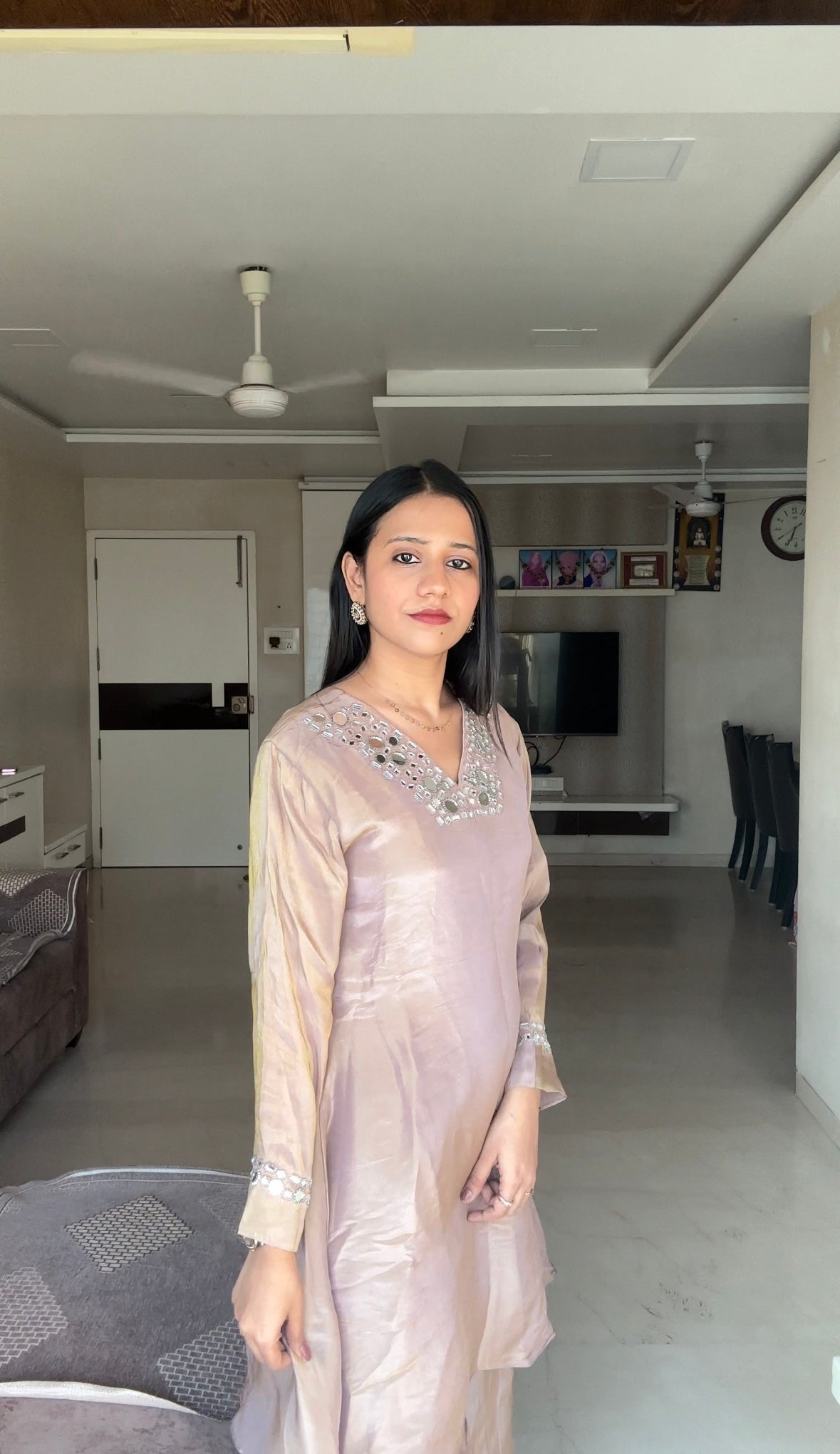 Up your ethnic glam game with our latest kurta set in tissue fabric adorned with real mirror work. The subtle shine, carefully place mirror work at sleeves and neck and the beautiful colour of the season is sure to make heads turn. The indo-western kurta set ensures you shine at Weddings, parties without too much of an effort.